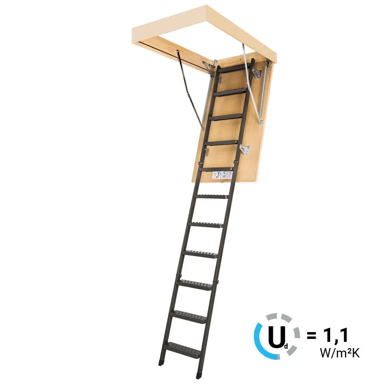 Лестница LMS представляет собой удобную складную конструкцию из металлического лестничного марша и термоизоляционной крышки люка. Контур уплотнения, установленный по периметру крышки, обеспечивает высокую степень герметичности и сохраняет тепло в помещении.