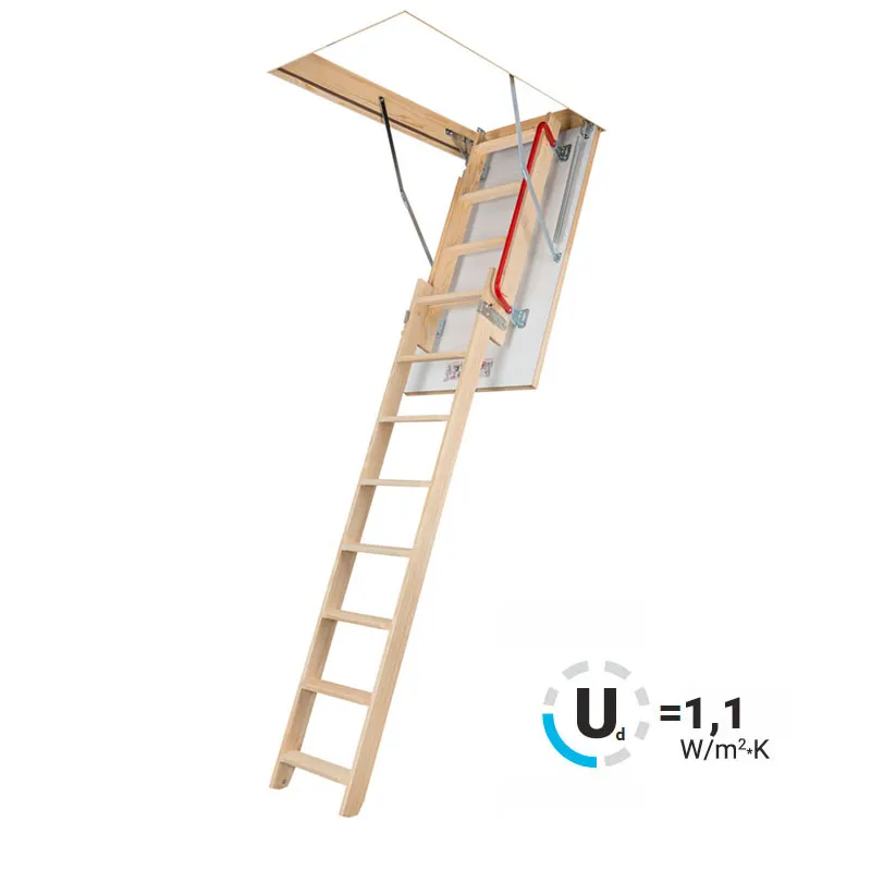 Противопожарная лестница, огнестойкость EI 60 Лестница чердачная складная металлическая 3-х секционная. Ступени полностью выполнены из металла и покрашена порошковой краской. Термоизоляционная крышка типа “сэндвич “, толщиной 66мм, утеплена пенопластом , облицована с двух сторон ДВП белого цвета. Короб деревянный высотой 170мм. Лестница имеет 3 уплотнителя, один проходит по периметру короба, и два по периметру крышки люка, в том числе и противопожарный.