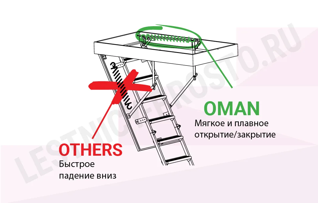 Все элементы лестницы выполнены из экологически чистых материалов и обработаны веществами, не содержащими тяжелых металлов. На ступенях антискользящие насечки. Короб лестницы изготовлен из металла. Термоизоляционная крышка типа "сэндвич" утеплена пенопластом, облицована с двух сторон ДСП белого цвета. Короб люка с уплотнителем. В комплекте деревянный стержень для открывания лестницы.