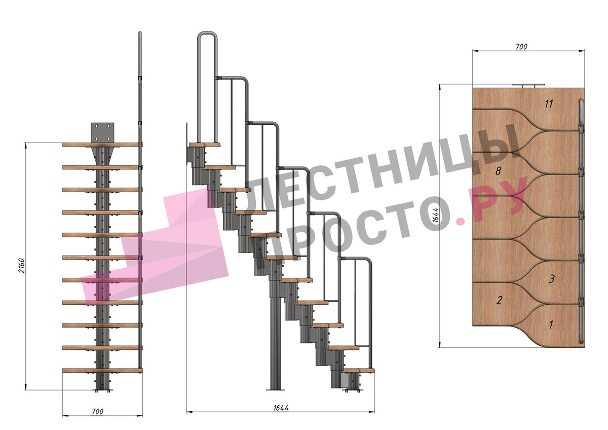 Лестница Prosto Urban Black гусиный шаг 700 мм, h198-288 см (11 ступеней), ясень
