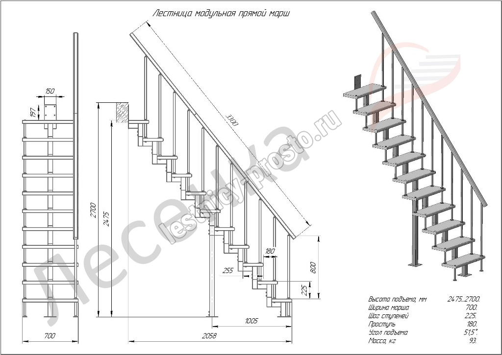 Модульная малогабаритная лестница Линия 2475-2700, Черный, Сосна, Нержавеющая сталь