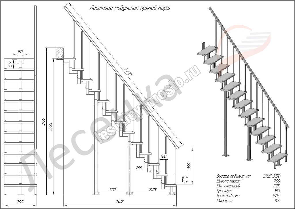 Модульная малогабаритная лестница Линия 2925-3150, Черный, Лиственница, Нержавеющая сталь