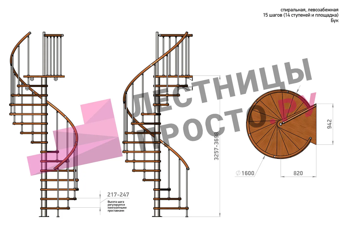 Винтовая лестница Prosto Spiral White D160см, h325.7-369.8 см, бук