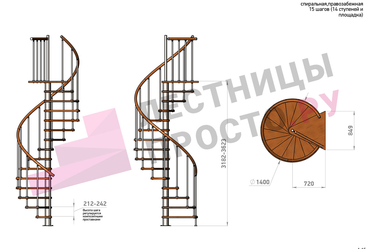 Высота ступеней регулируется с шагом 3 мм. в пределах 212-242 мм., благодаря чему, лестница прекрасно подгоняется под необходимую высоту.