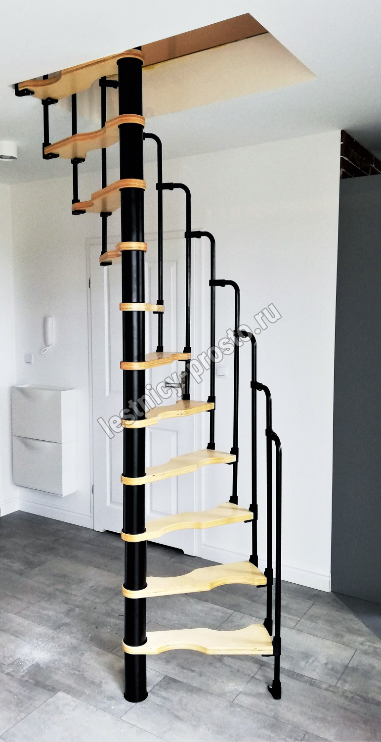 Компактная надёжная лестница. Ступени толщиной 30 мм, изготовлены из массива берёзы по технологии Multiplex, лакированные. Все металлические части оцинкованы, горячим способом и покрыты порошковой краской - черного цвета; Лестница имеет надёжную несущую стальную конструкцию.