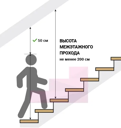 Высота межэтажного прохода вертикальное расстояние от верхней поверхности любой проступи лестницы до нижней поверхности перекрытия. Для комфортного и безопасного перемещения высота прохода должна быть не менее 200 см.
